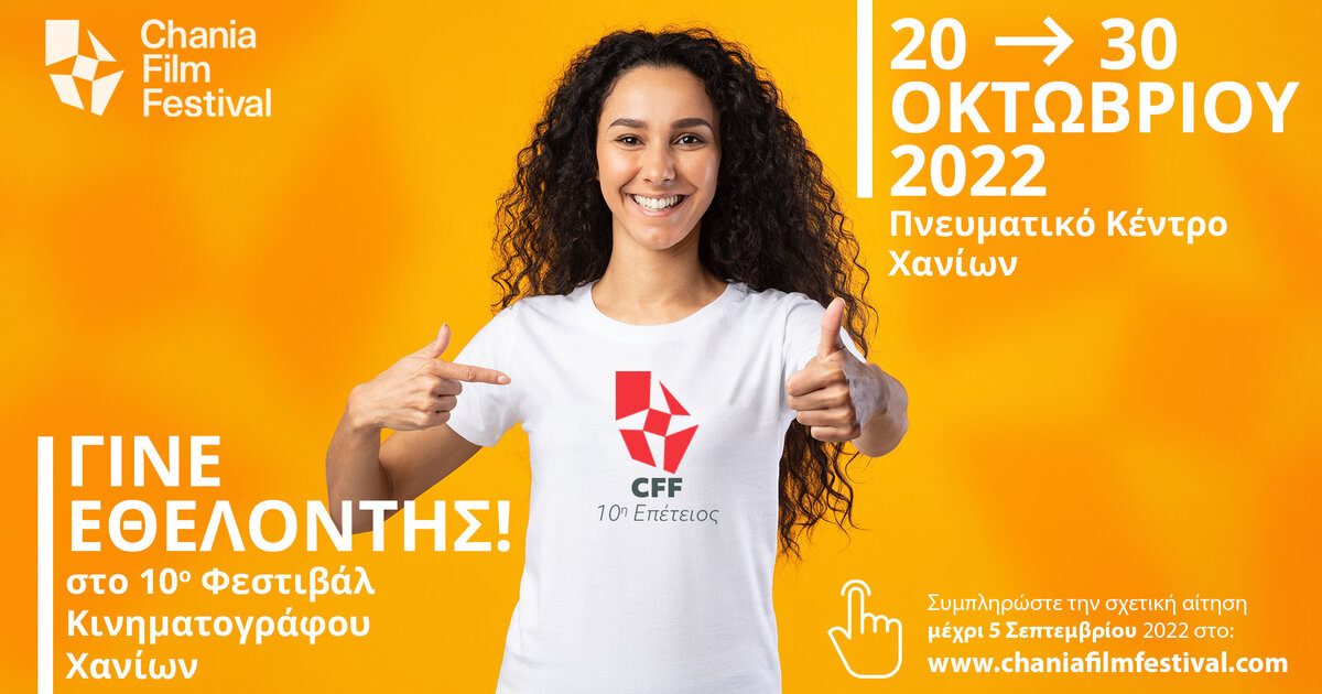 Πρόσκληση σε εθελοντές απευθύνει το Φεστιβάλ Κινηματογράφου Χανίων για την 10η διοργάνωσή του, που θα πραγματοποιηθεί από τις 20 Οκτωβρίου έως και τις 30 Οκτωβρίου 2022, σε φυσική και online μορφή.