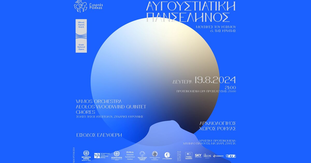 Η φετινή διοργάνωση με τίτλο "Αυγουστιάτικη Πανσέληνος Μουσικές του Κόσμου και της Κρήτης" των Πολιτιστικών Συλλόγων Ρόκκας και Κεράς, φέρνει στη σκηνή την Vamos Orchestra, το Aeolos Woodwind Quintet και τις Chores, με σολίστες τους Τάσο Αποστόλου και Ζαχαρία Καρούνη.