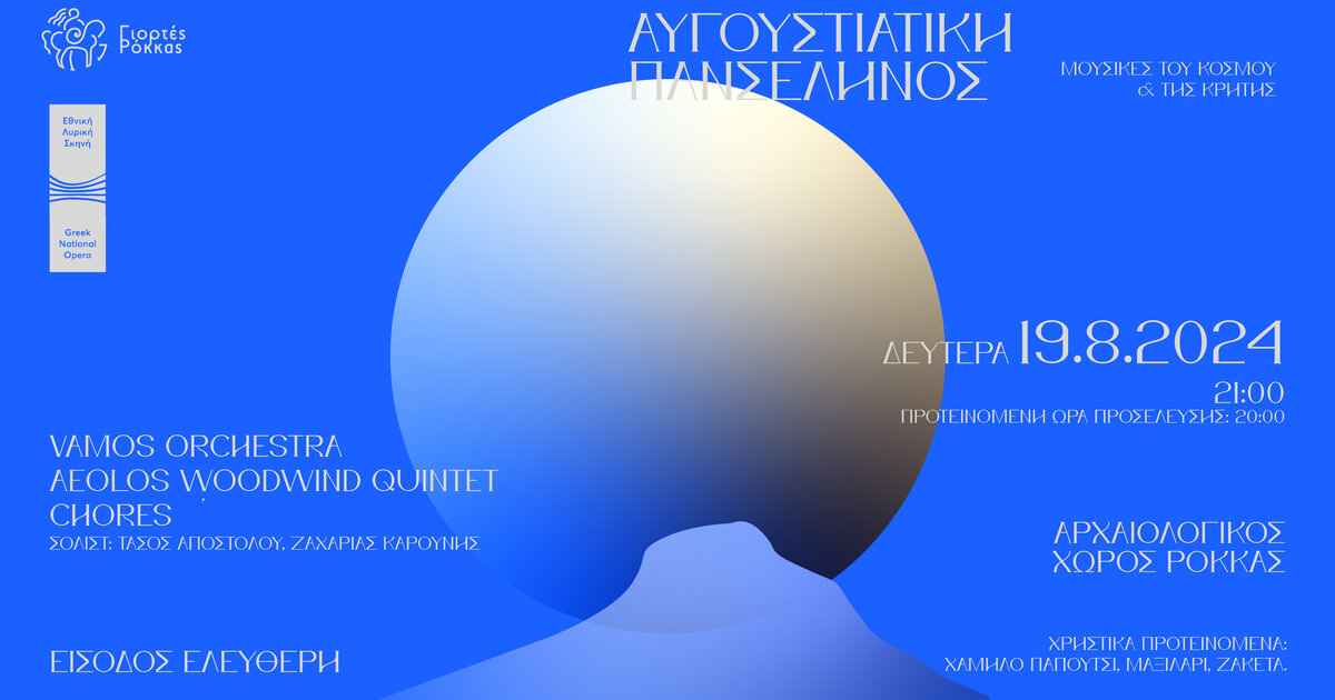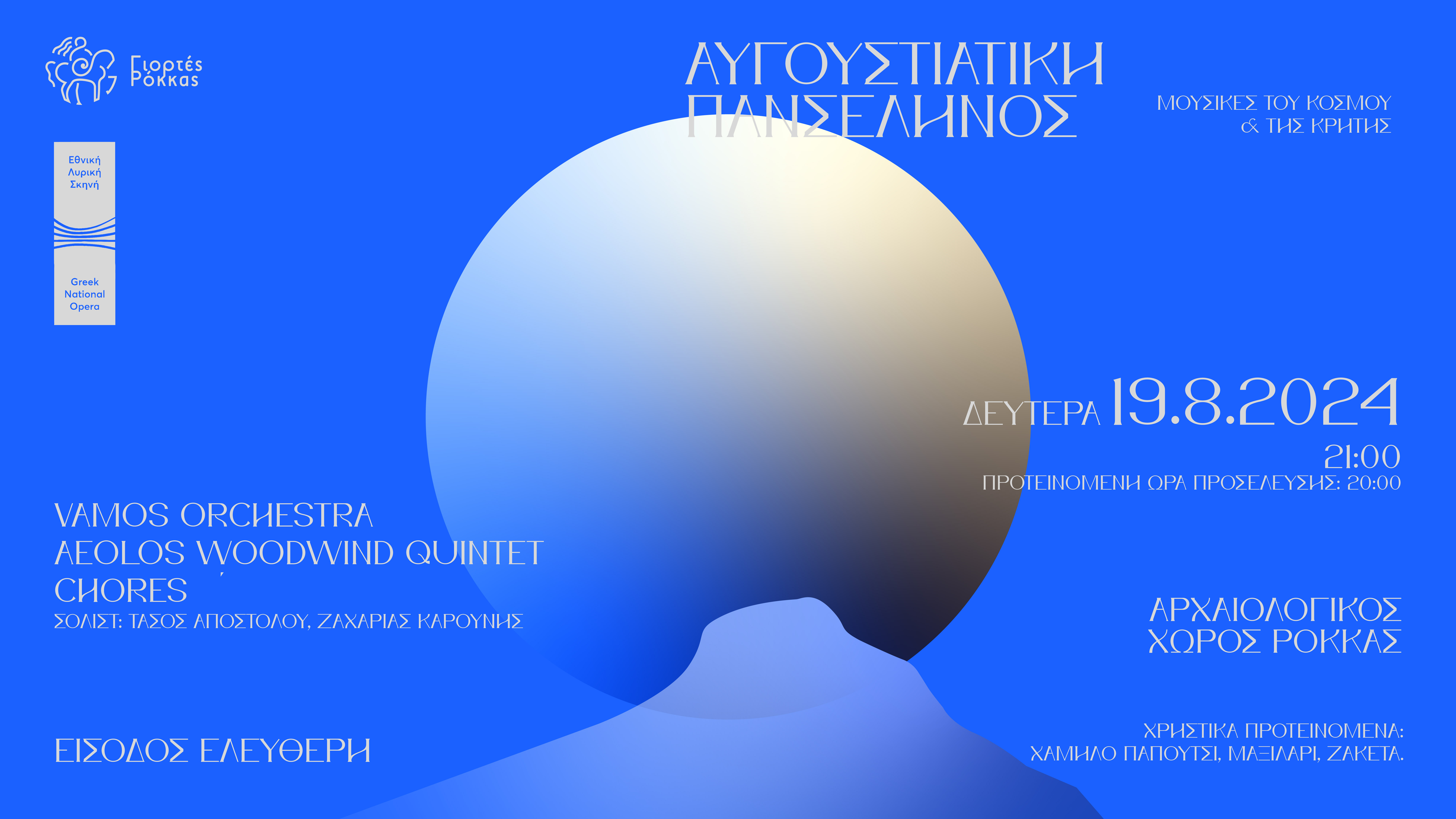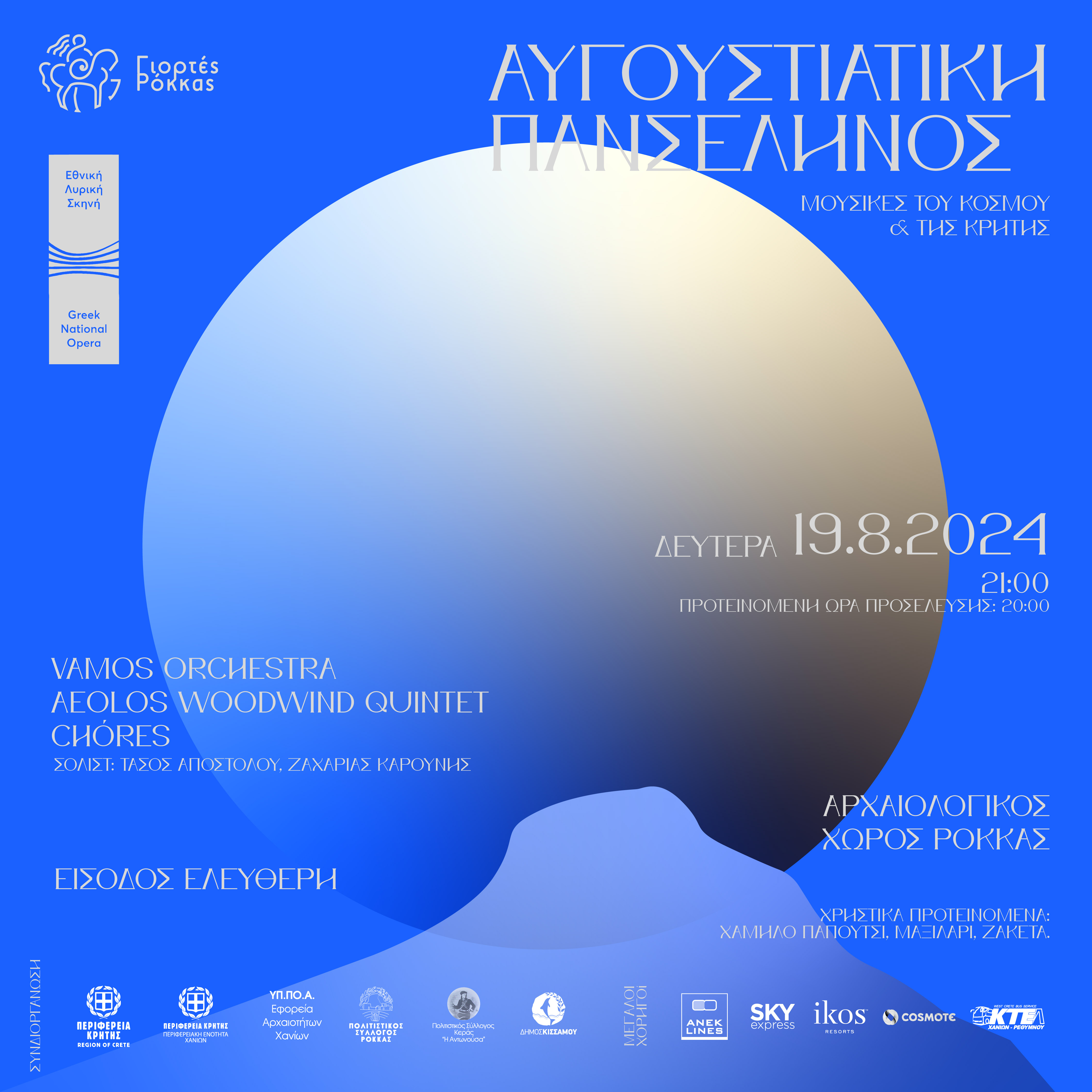 Η φετινή διοργάνωση με τίτλο "Μουσικές του Κόσμου και της Κρήτης στην Πανσέληνο" των Πολιτιστικών Συλλόγων Ρόκκας και Κεράς, φέρνει στη σκηνή την Vamos Orchestra, το Aeolos Woodwind Quintet και τις Chores, με σολίστες τους Τάσο Αποστόλου και Ζαχαρία Καρούνη.