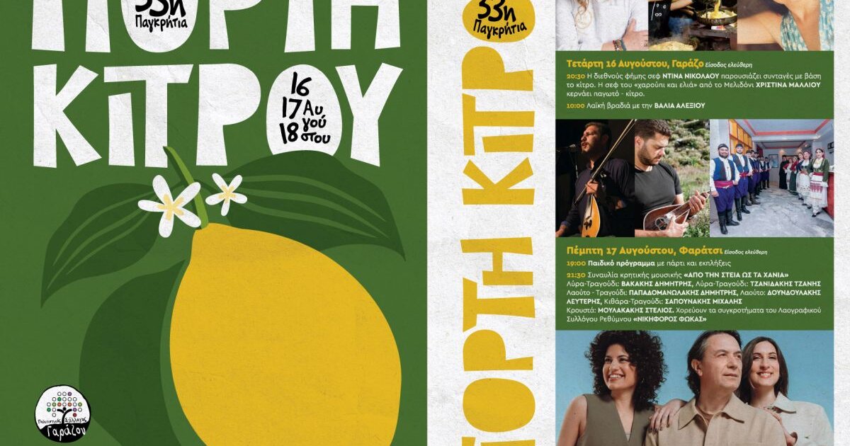 Η 33η Παγκρήτια Γιορτή Κίτρου θα πραγματοποιηθεί στις 16, 17 και 18 Αυγούστου στην Κοινότητα Γαράζου Δήμου Μυλοποτάμου και θα φιλοξενηθεί στο ομώνυμο χωριό καθώς και στον οικισμό Φαράτσι.