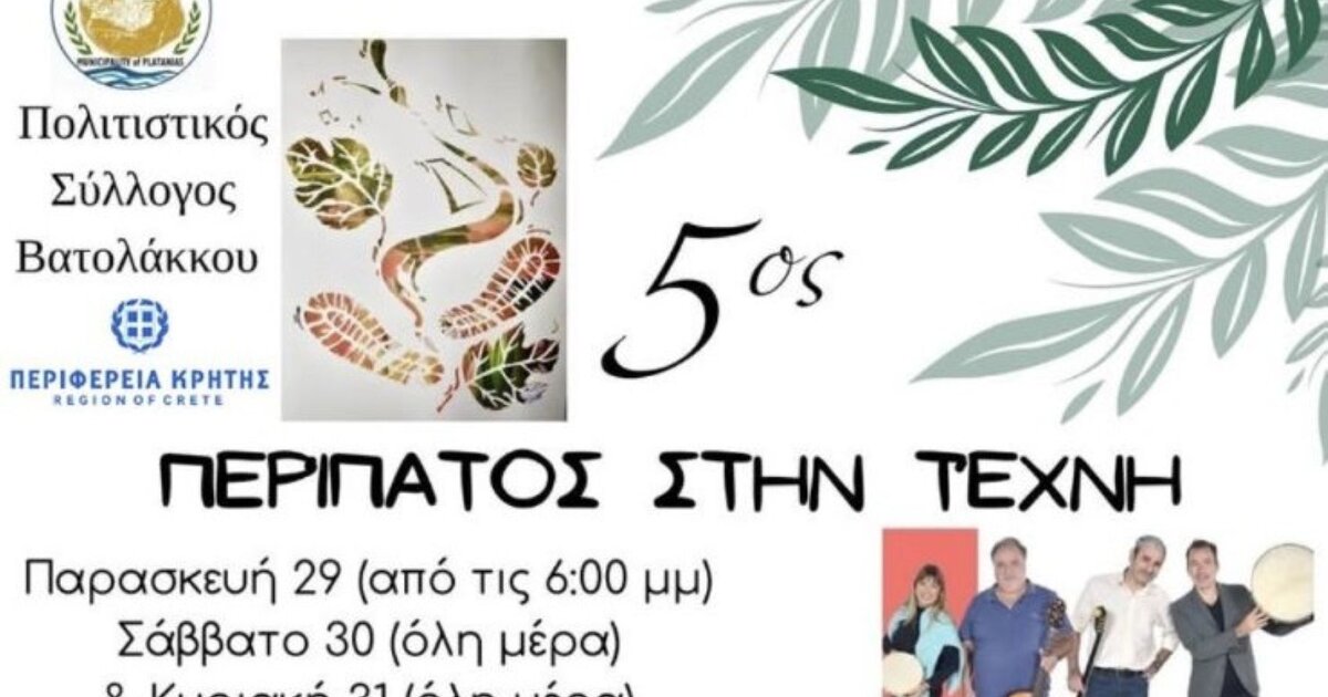 Ο Δήμος Πλατανιά στηρίζει τη διοργάνωση του Πολιτιστικού Συλλόγου Βατολάκκου και με την αρωγή της Περιφέρειας Κρήτης, πραγματοποιεί για 5η χρονιά τον θεσμό «Περίπατος στην Τέχνη», στις 29, 30 και 31 Αυγούστου, στο μονοπάτι του Βαλασαμιώτη, στον Βατόλακκο, όπου πάνω από πενήντα Έλληνες και ξένοι καλλιτέχνες συναντιούνται κάτω από τη σκιά των δέντρων δίπλα στο ποτάμι.