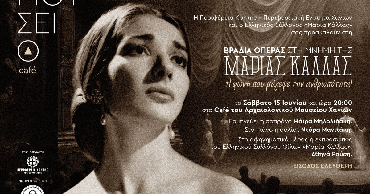 Η Περιφέρεια Κρήτης - Περιφερειακή Ενότητα Χανίων και ο Ελληνικός Σύλλογος ‘’Μαρία Κάλλας’’ διοργανώνουν ΒΡΑΔΙΑ ΟΠΕΡΑΣ ΣΤΗ ΜΝΗΜΗ ΤΗΣ ΜΑΡΙΑΣ ΚΑΛΛΑΣ το Σάββατο 15 Ιουνίου και ώρα 20:00, στο Καφέ του Αρχαιολογικού Μουσείου Χανίων.