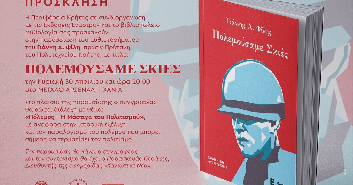 Η Περιφέρεια Κρήτης – Περιφερειακή Ενότητα Χανίων σε συνδιοργάνωση με τις εκδόσεις «Έναστρον» και το βιβλιοπωλείο «Μυθολογία» και με την υποστήριξη του Δήμου Χανίων και της ΚΕΠΠΕΔΗΧ – ΚΑΜ, παρουσιάζει το μυθιστόρημα του Γιάννη Α. Φίλη, πρώην Πρύτανη του Πολυτεχνείου Κρήτης, με τίτλο: