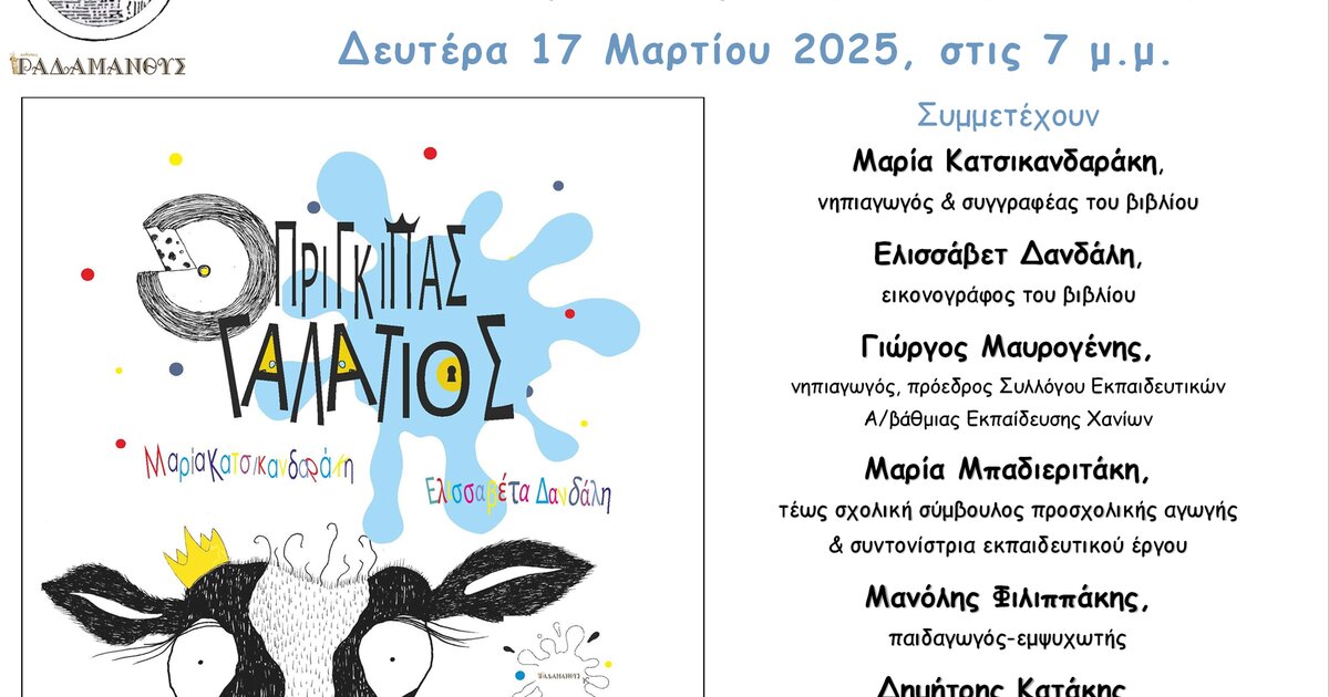 Οι Εκδόσεις Ραδάμανθυς και ο Σύλλογος Εκπαιδευτικών Α/βάθμιας Εκπαίδευσης Χανίων, παρουσιάζουν το βιβλίο της νηπιαγωγού Μαρίας Κατσικανδαράκη «Ο πρίγκιπας Γαλάτιος», σε εικονογράφηση της Ελισσάβετ Δανδάλη. Η εκδήλωση θα γίνει τη Δευτέρα 17 Μαρτίου 2025, στις 7 το απόγευμα, στον χώρο των Εκδόσεων Ραδάμανθυς στα Χανιά.