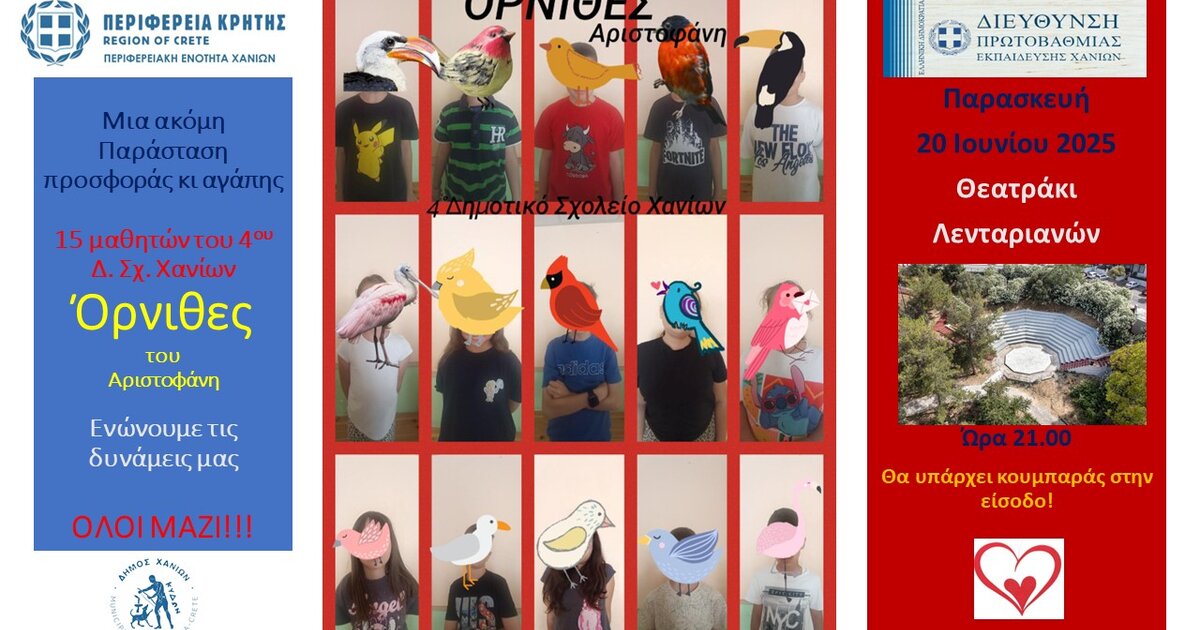 Η Διεύθυνση Πρωτοβάθμιας Εκπαίδευσης Χανίων και το 4ο Δημοτικό Σχολείο Χανίων προσκαλούν στη μαθητική θεατρική παράσταση "Όρνιθες" του Αριστοφάνη σε σκηνοθεσία της εκπαιδευτικού Θεατρικής Αγωγής κας Ειρήνης Μαμάση, διασκευή κειμένου: Γ. Τσάμης & Μ. Λεμπέση και με τη μουσική του Μάνου Χατζιδάκι