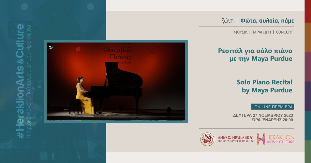 Το ρεσιτάλ για σόλο πιάνο με την Maya Purdue που πραγματοποιήθηκε τον Δεκέμβριο του 2022 στην Βασιλική του Αγίου Μάρκου, στο πλαίσιο του 6ου Φεστιβάλ Πιάνου Δήμου Ηρακλείου είναι πλέον διαθέσιμο στο κανάλι πολιτισμού, Heraklion Arts and Culture.