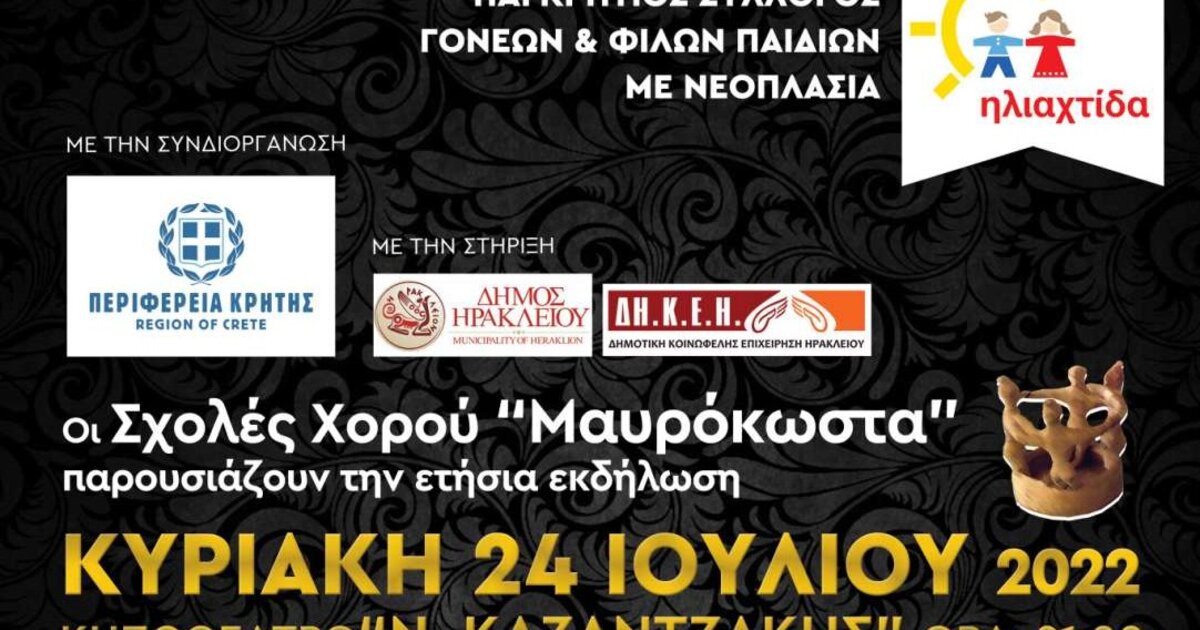 Ο Παγκρήτιος σύλλογος γονέων και φίλων παιδιών με νεοπλασία "Ηλιαχτίδα" διοργανώνει μουσικοχορευτική φιλανθρωπική παράσταση την Κυριακή στις 24 Ιουλίου στο κηποθέατρο Ν. Καζαντζάκης με τις σχολές χορού "Μαυρόκωστα" και τα μουσικά συγκροτήματα των :