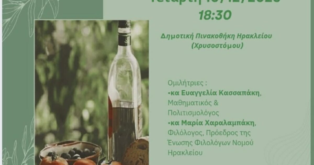 Το Λύκειο των Ελληνίδων Ηρακλείου σε συνεργασία με την Ένωση Φιλολόγων Νομού Ηρακλείου, διοργανώνει εκδήλωση, με αφορμή την ανακήρυξη της Περιφέρειας Κρήτης ως Ευρωπαϊκή Περιφέρεια Γαστρονομίας 2026, με θέμα: «Διατροφή και Κρητικός Πολιτισμός: Μνήμες, Γεύσεις, Συμβολισμοί», στις 10 Δεκεμβρίου 2025, ώρα 6.30 μ.μ. στη Δημοτική Πινακοθήκη Ηρακλείου (Χρυσοστόμου).