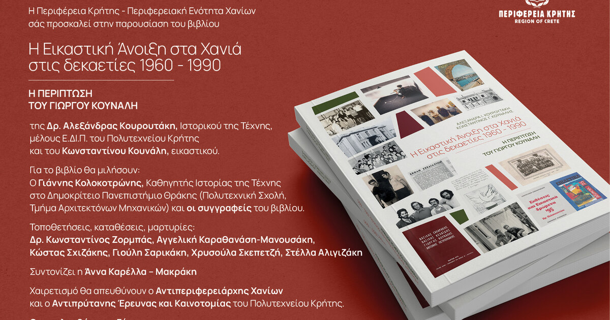 Η Περιφέρεια Κρήτης - Περιφερειακή Ενότητα Χανίων διοργανώνει τη Δευτέρα 25 Σεπτεμβρίου 2023, στο Πνευματικό Κέντρο Χανίων, στις 19:30, την παρουσίαση του βιβλίου της Δρ. Αλεξάνδρας Κουρουτάκη, ιστορικού της τέχνης, μέλους Ε.ΔΙ.Π. του Πολυτεχνείου Κρήτης και του Κωνσταντίνου Κουνάλη, εικαστικού, με τίτλο: