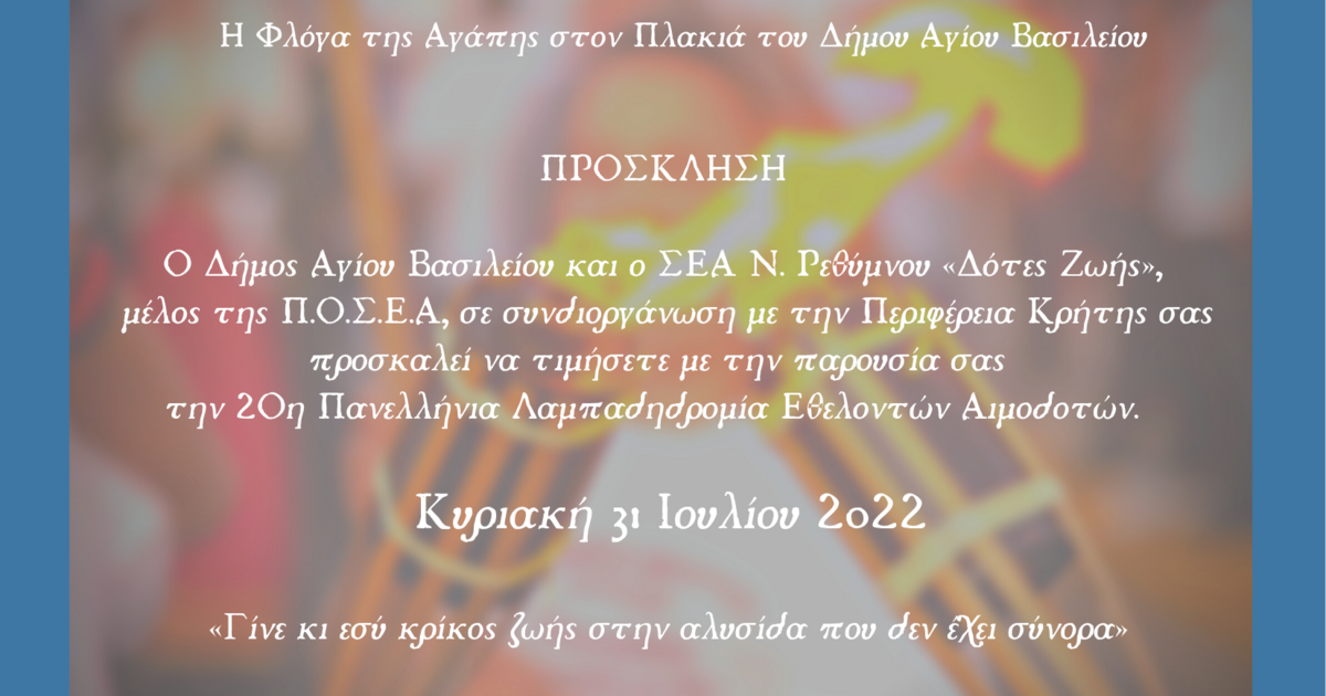 Ο Σύλλογος Εθελοντών Αιμοδοτών Ν. Ρεθύμνου «Δότες Ζωής», μέλος της Π.Ο.ΣΕ.Α. (Πανελλήνια Ομοσπονδία Συλλόγων Εθελοντών Αιμοδοτών) θα υποδεχτεί τη Φλόγα της Αγάπης στο Ρέθυμνο, την Κυριακή στις 31 Ιουλίου 2022 για να την οδηγήσει στον Πλακιά του Δήμου Αγίου Βασιλείου, στο γραφικό χωριό που βρίσκεται νότια του Νομού Ρεθύμνου.