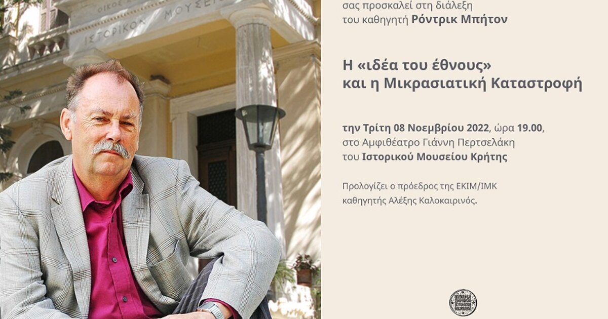 Η Εταιρία Κρητικών Ιστορικών Μελετών οργανώνει διάλεξη με θέμα Η «ιδέα του έθνους» και η Μικρασιατική Καταστροφή με ομιλητή τον Ρόντρικ Μπήτον, ομότιμο καθηγητή Νεοελληνικής και Βυζαντινής Ιστορίας στο Πανεπιστήμιο του Λονδίνου.