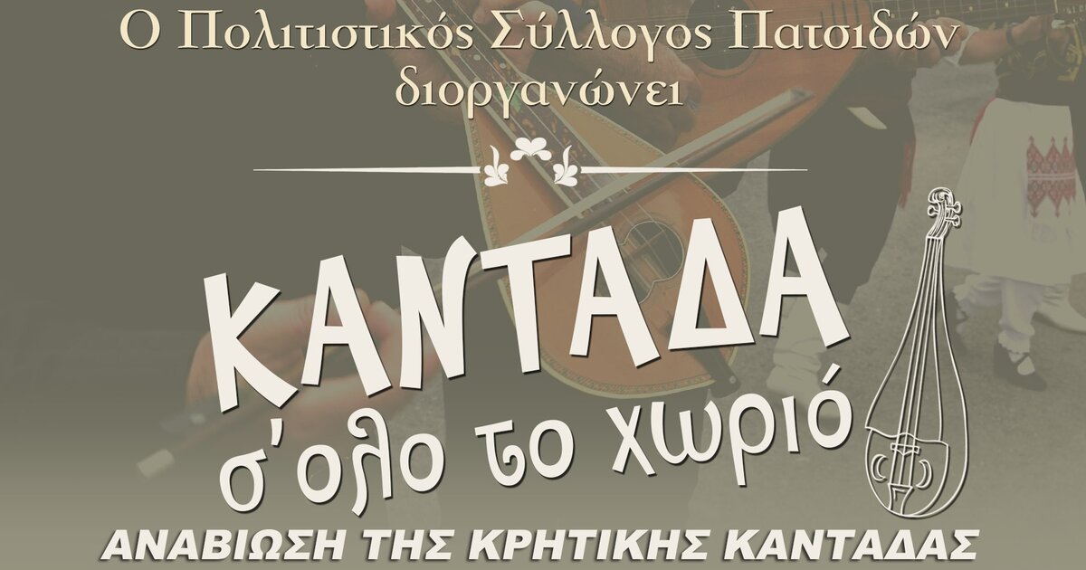 Ο Πολιτιστικός Σύλλογος Πατσίδων διοργανώνει εκδήλωση για την Αναβίωση της Κρητικής Καντάδας στα παραδοσιακά σοκάκια του χωριού την Τετάρτη 18 Ιουνίου από τις 8 το βράδυ.
