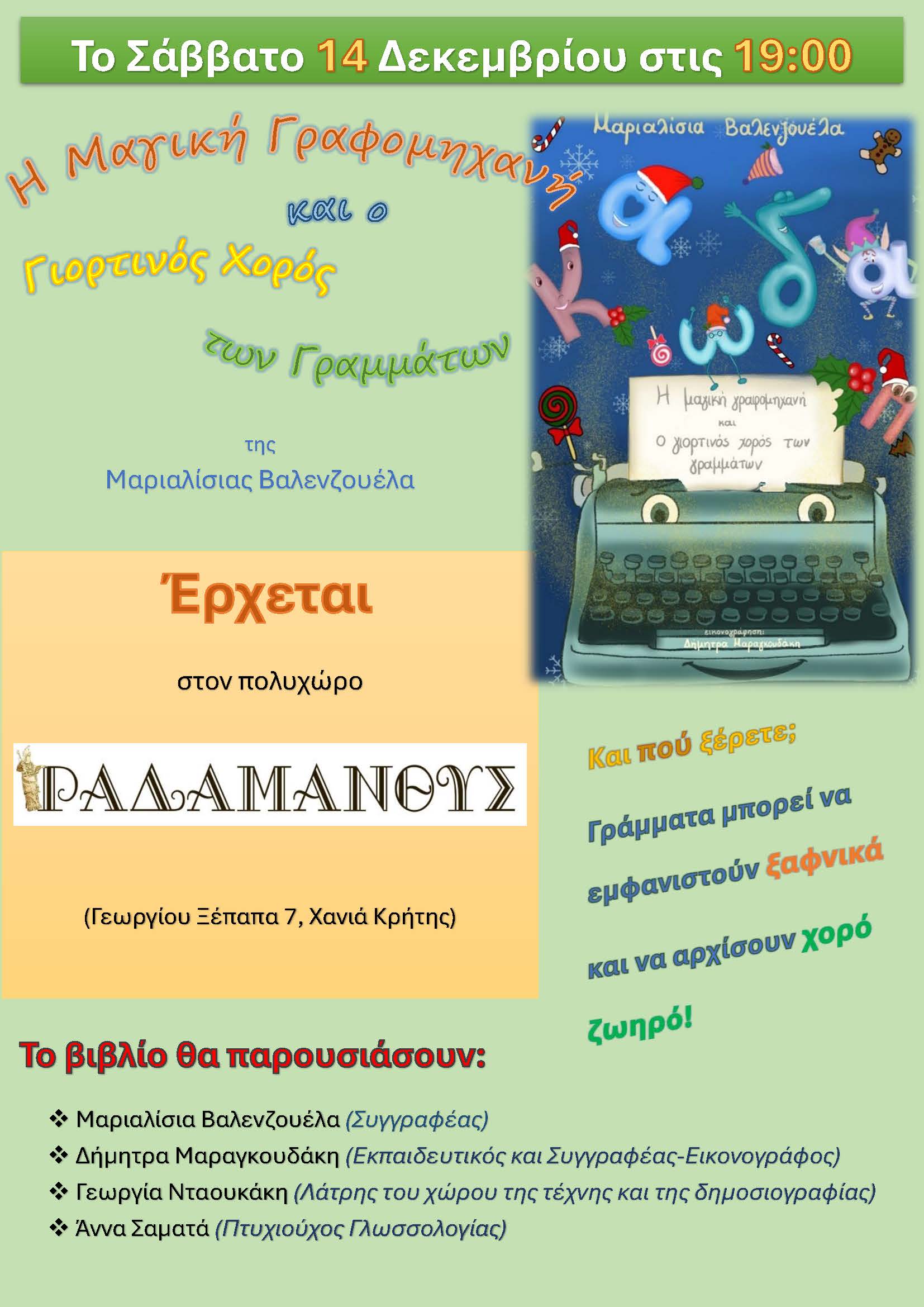 Με ένα γιορτινό παραμύθι, διασκεδαστικό και εκπαιδευτικό ταυτόχρονα, υποδεχόμαστε τις γιορτές στις Εκδόσεις Ραδάμανθυς. Το νέο έργο της Μαριαλίσιας Βαλενζουέλα είναι αφιερωμένο στα παιδιά, που θα έχουν την ευκαιρία να συναντήσουν γράμματα και λέξεις σ’ ένα διαφορετικό πλαίσιο, μέσα από την οπτική του παραμυθιού, μέσα από την αλληλεπίδραση του παιχνιδιού. Την εικονογράφηση του βιβλίου υπογράφει η Δήμητρα Μαραγκουδάκη.