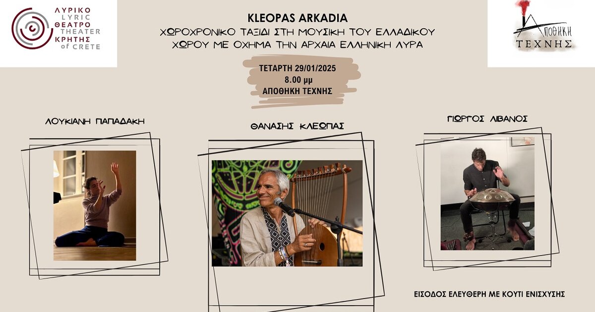 Το Λυρικό Θέατρο Κρήτης και ο καλλιτεχνικός Πολυχώρος Αποθήκη Τέχνης παρουσιάζουν, αύριο Τετάρτη 29/01/25 στις 8.00μμ την παράσταση "KLEOPAS ARKADIA".