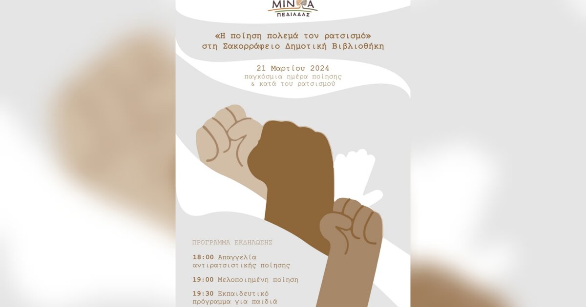 Ο Δήμος Μινώα Πεδιάδας σε συνεργασία με τη Σακορράφειο Δημοτική Βιβλιοθήκη και το Γραφείο Κοινωνικής Υπηρεσίας και Ισότητας των Φύλων, με αφορμή τον εορτασμό της Παγκόσμιας Ημέρας Ποίησης και την Παγκόσμια Ημέρα κατά του Ρατσισμού διοργανώνει, την Πέμπτη 21 Μαρτίου 2024 και ώρα 18:00, στη Σακορράφειο Δημοτική Βιβλιοθήκη στο Καστέλλι, την εκδήλωση: «Η ποίηση πολεμά τον ρατσισμό». Στα πλαίσια της εκδήλωσης θα απαγγελθούν και θα ερμηνευτούν αντιρατσιστικά ποιήματα, ενώ θα πραγματοποιηθεί εκπαιδευτικό πρόγραμμα για παιδιά.