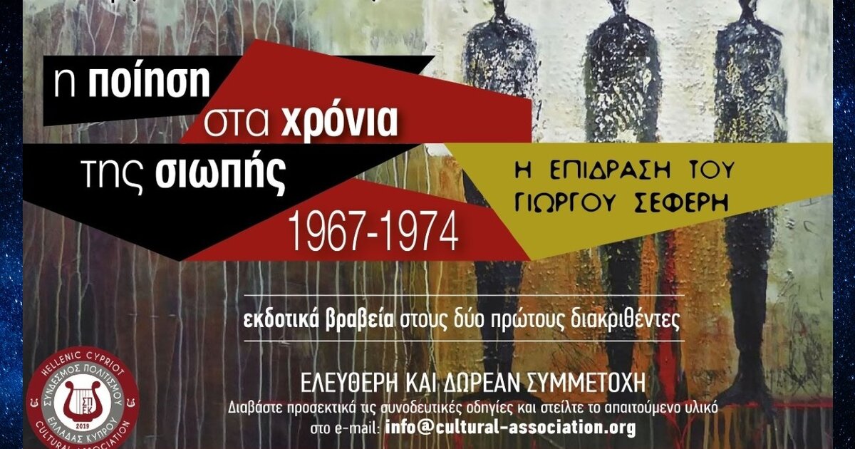 Ο Σύνδεσμος Πολιτισμού Ελλάδας Κύπρου (ΣΠΕΚ) προκηρύσσει τον 17ο διαγωνισμό με θεματικό άξονα την ποίηση και τον στοχασμό στην περίοδο , στο της δικτατορίας (1967–1974) και την ηθική, αισθητική και δημόσια επίδραση του Γιώργου Σεφέρη. Στόχος μας είναι η δημιουργική αναψηλάφηση μιας εποχής όπου η σιωπή και η λογοκρισία συνάντησαν την αντοχή του λόγου. ΔΕΙΤΕ ΕΔΩ