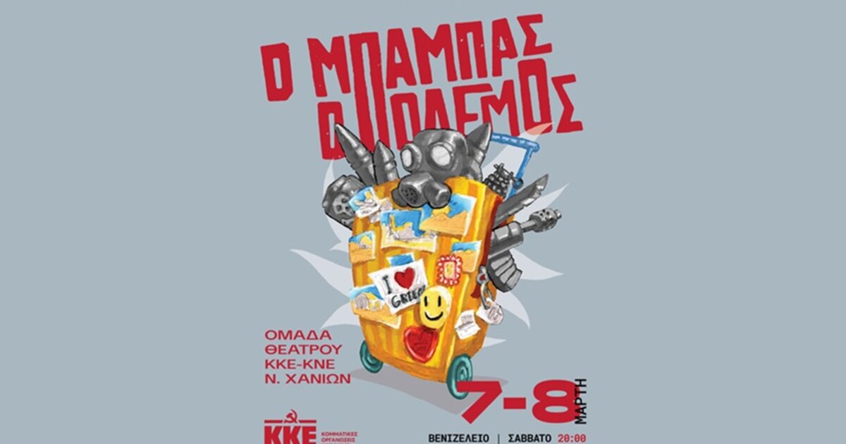 Η Θεατρική Ομάδα ΚΚΕ-ΚΝΕ Χανίων παρουσιάζει την καυστική σάτιρα του Ιάκωβου Καμπανέλλη «Ο Μπαμπάς ο Πόλεμος» στο Βενιζέλειο Ωδείο Χανίων, το Σάββατο 7 και την Κυριακή 8 Μαρτίου, στις 20:00.