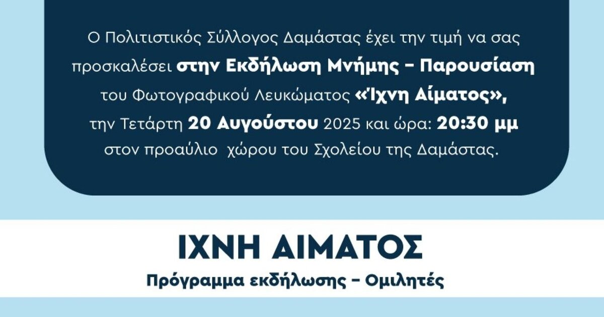 Εκδήλωση Μνήμης – Παρουσίαση Φωτογραφικού Λευκώματος στον προαύλιο χώρο του Σχολείου Δαμάστας στις 20 Αυγούστου, στις 9 το βράδυ