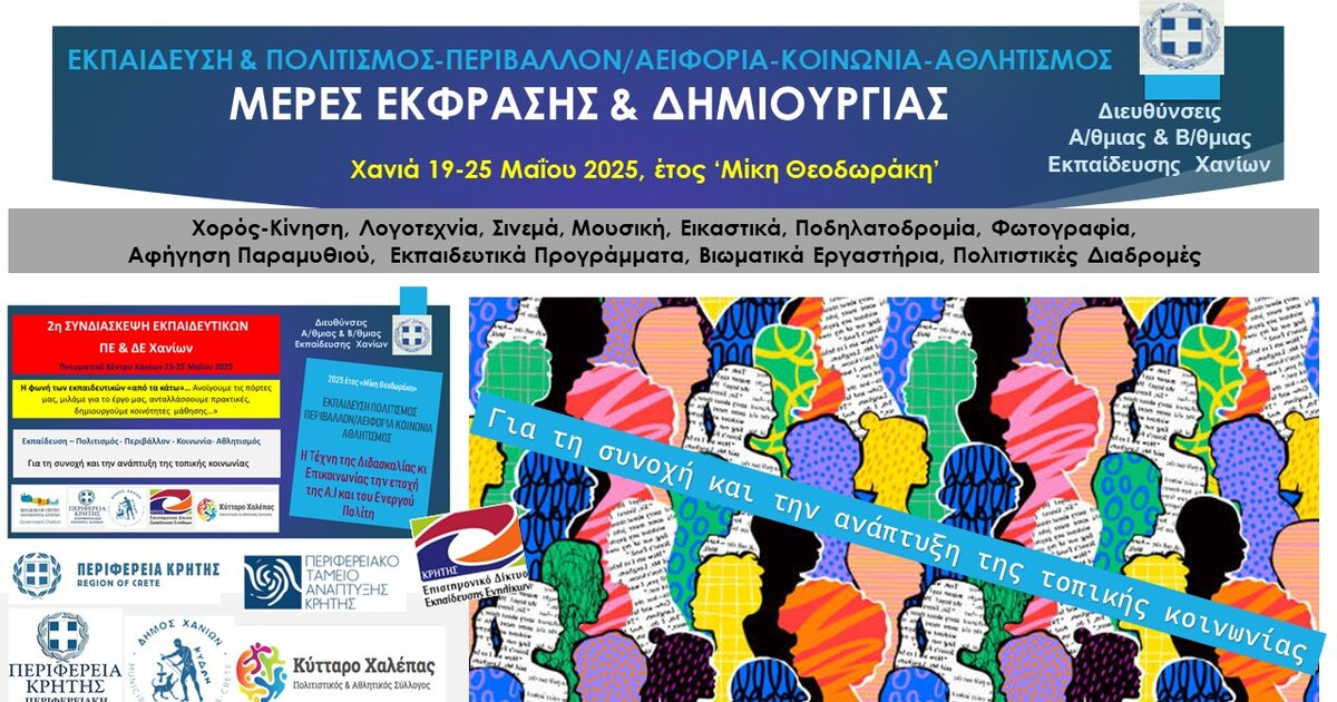 Κορύφωση της εβδομάδας θα αποτελέσει η 2η Συνδιάσκεψη των Εκπαιδευτικών των Χανίων, με τελετή έναρξης την Παρασκευή 23 Μαΐου 2025, στις 19:00, στο Θέατρο «Μίκης Θεοδωράκης».