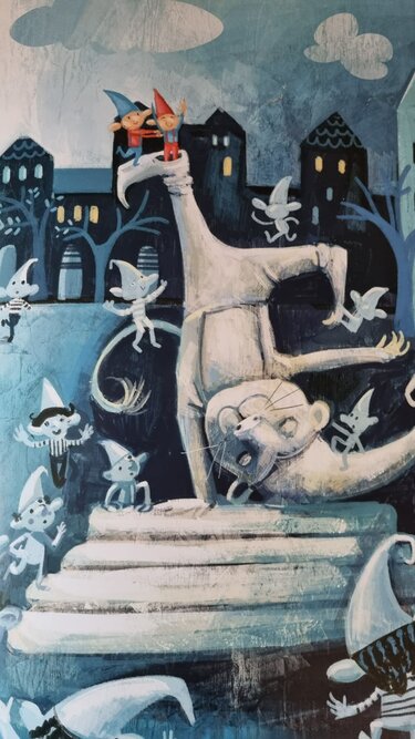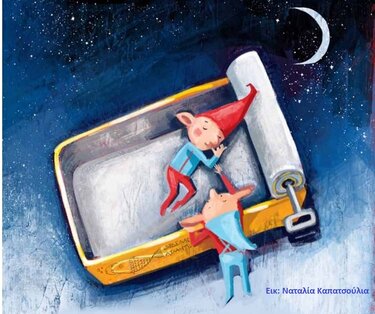 Ο Τρακατρούκας έκανε ένα βήμα πιο μπροστά απ’ όλους και μου έδωσε ένα μικρό διπλωμένο χαρτί, με χέρια που τρέμανε. Έσκυψα και το πήρα, το άνοιξα προσεκτικά και χίλια γράμματα κι εικόνες άρχισαν να αιωρούνται στον αέρα. Τρελό χορό σαν να ΄χαν στήσει και σχημάτιζαν λέξεις πολύτιμες : Ευχαριστώ, Χριστούγεννα, δώρο, κουραμπιές, μελομακάρονο, στολίδι, καρδιά, χαρά, γέλιο και ονόματα, πολλά ονόματα. Κατάλαβα τι ήταν. Όλα τα ονόματα των παιδιών που τους αγκάλιασαν με την αγάπη τους, που τους καλοδέχτηκαν τα βραδιά στα σπίτια τους διαβάζοντας τα βιβλία τους, ή στα μέρη που επισκέφθηκαν για να που τις ιστορίες τους…