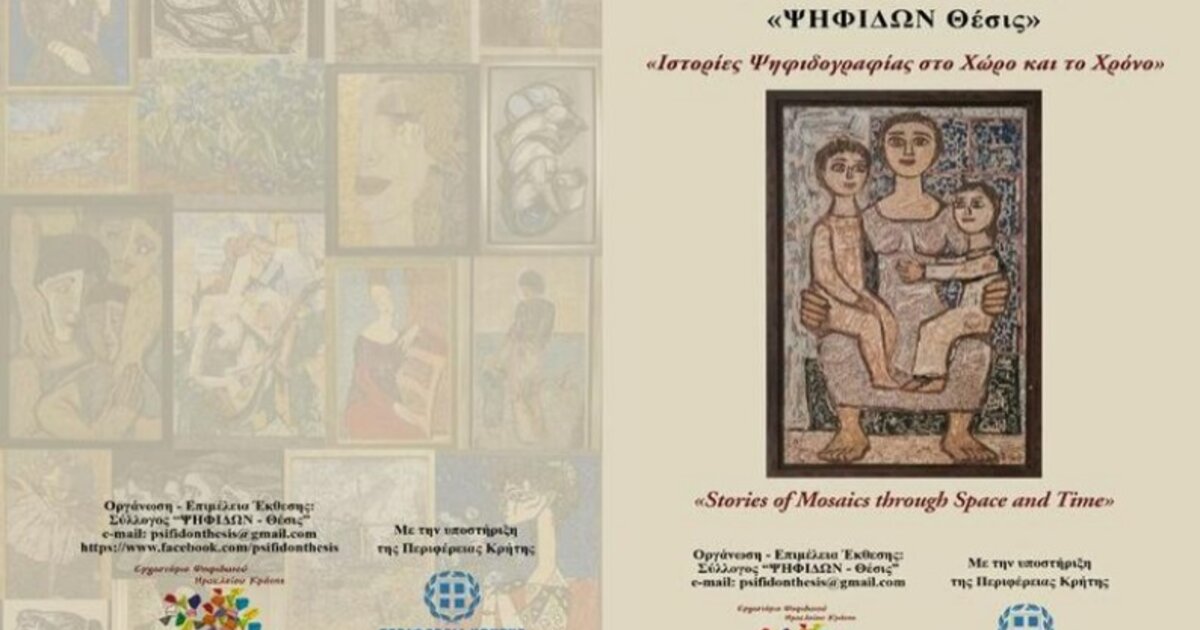 Ο Σύλλογος «ΨΗΦΙΔΩΝ Θέσις» διοργανώνει, με την υποστήριξη της Περιφέρειας Κρήτης, ομαδική έκθεση ψηφιδωτού από 20 έως 27 Απριλίου 2023 στο Πολιτιστικό Συνεδριακό Κέντρο Ηρακλείου (Πλαστήρα & Ρωμανού).