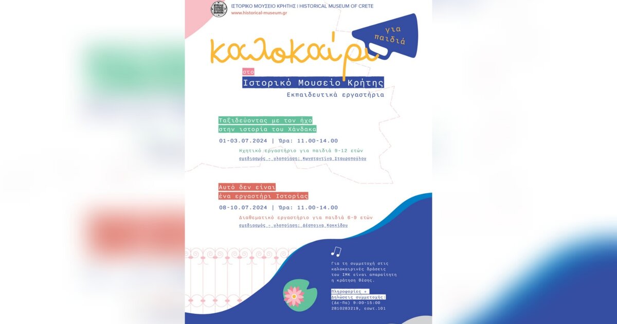 Ο Ιούλιος φέρνει δύο εκπαιδευτικά εργαστήρια για παιδιά. Από τη Δευτέρα 1 ως την Τετάρτη 3 Ιουλίου θα πραγματοποιηθεί το ηχητικό διαδραστικό εργαστήριο, «Ταξιδεύοντας με τον ήχο στην ιστορία του Χάνδακα», με την Κωνσταντίνα Σταυροπούλου. Ενώ στη συνέχεια, από τη Δευτέρα 8 ως την Τετάρτη 10 Ιουλίου θα ακολουθήσει το διαθεματικό εργαστήριο, «Αυτό δεν είναι ένα εργαστήρι Ιστορίας», με τη Δέσποινα Κοκκίδου.