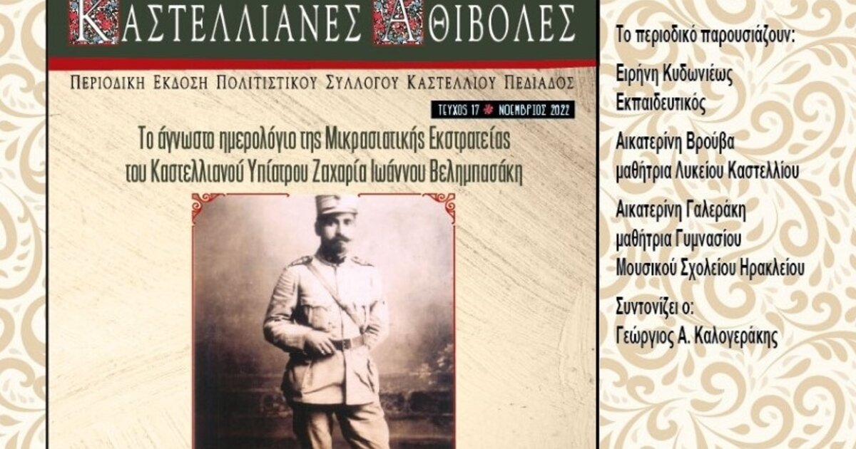 Την Κυριακή 8 Ιανουαρίου 2023, στην αίθουσα του Πολιτιστικού Κέντρου Καστελλίου «Μιχαήλ Σάλλας» στις 6 το απόγευμα, παρουσιάζεται το 17ο τεύχος του περιοδικού Καστελλιανές Αθιβολές.