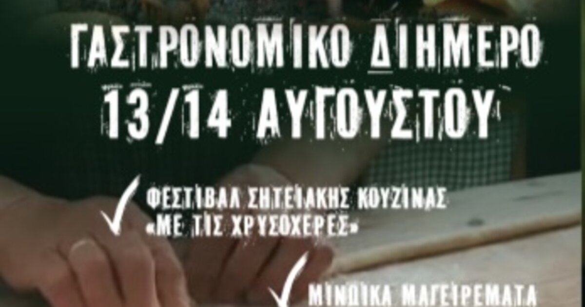 -13/8 19.00 στην Κεντρική Πλατεία της Σητείας, Φεστιβάλ Σητειακής Κουζίνας με τις "Χρυσοχέρες". "Οι Χρυσοχέρες" είναι οι πρωταγωνίστριες της Σητειακής Κουζίνας και οι βασικοί πυλώνες διάσωσης και διάδοσης της. "Οι Χρυσοχέρες" είναι οι νοικοκεράδες του σπιτιού, η μαμά, η γιαγιά, η θεία οι οποίες θα μας παρουσιάσουν με τον δικό τους, μοναδικό αυθεντικό τρόπο, παραδοσιακές Σητειακές συνταγές χαμένες μέσα στο χρόνο. Μαζί με τις "Χρυσοχέρες" η διακεκριμένη Σεφ Ντίνα Νικολάου και η Πρόεδρος του Συλλόγου Φεστιβάλ Κρητικής Κουζίνας Λένα Ηγουμενάκη.