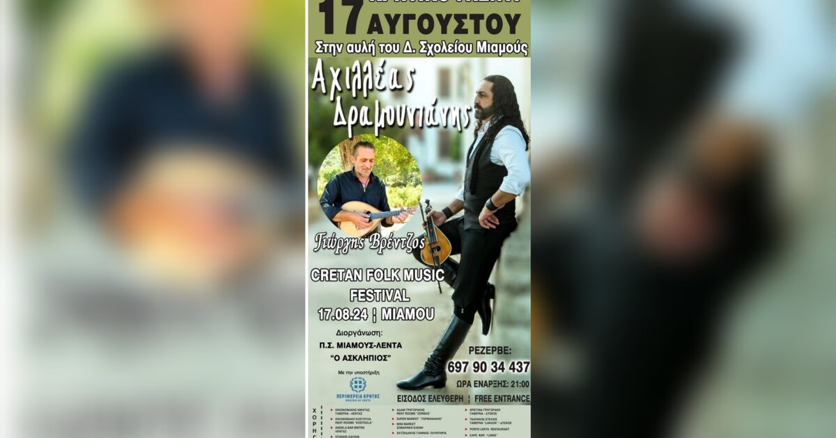 Ο Πολιτιστικός Σύλλογος Μιαμούς-Λέντα «Ο Ασκληπιός» οργανώνει κρητικό γλέντι στην Μιαμού στην αυλή του Δημοτικού Σχολείου το Σάββατο 17 Αυγούστου στις 9 το βράδυ με το συγκρότημα του Αχιλλέα Δραμουντανη και την στήριξη της Περιφέρειας Κρήτης.