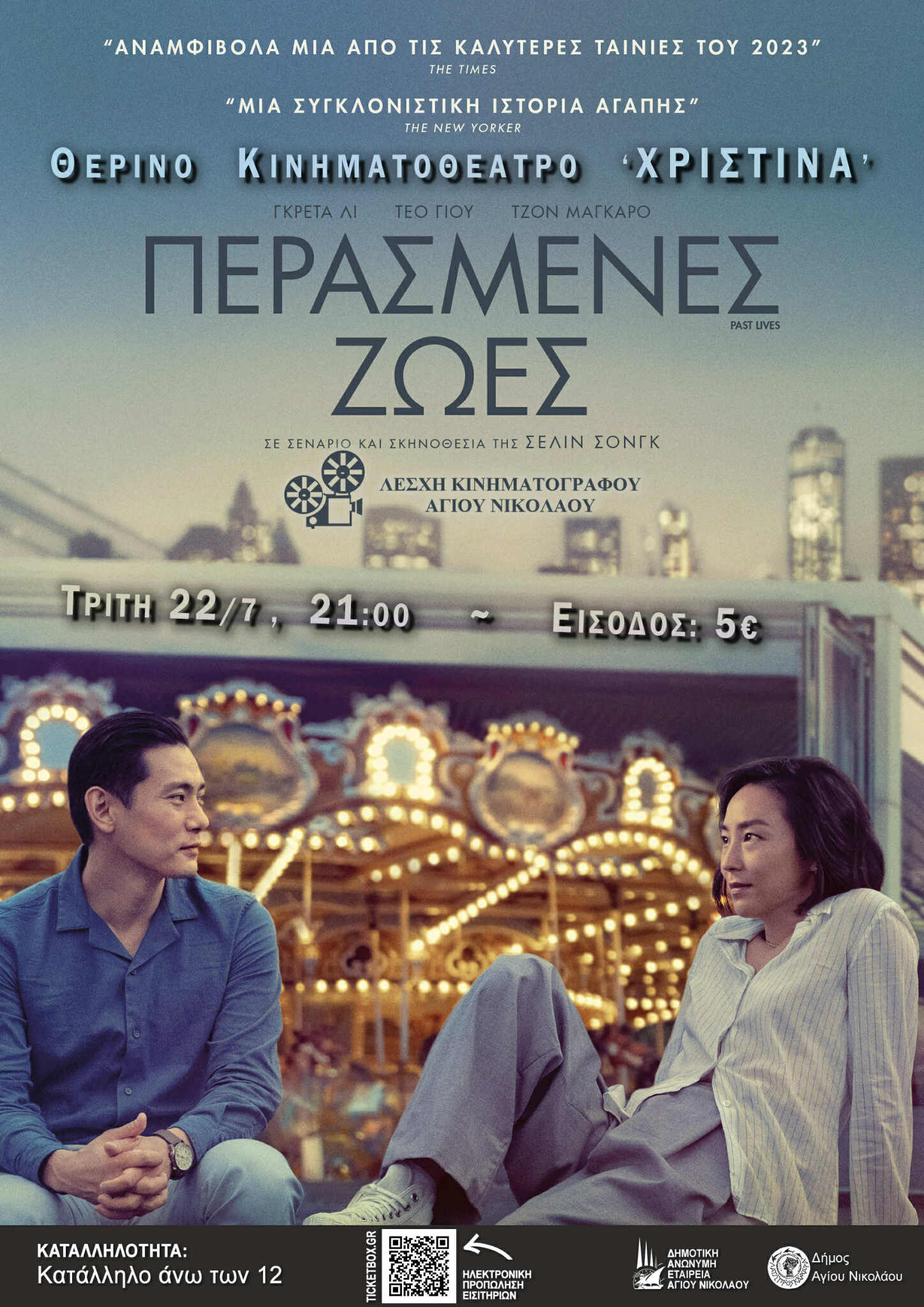 Συνεχίζονται κάθε Τρίτη τον Ιούλιο οι εβδομαδιαίες προβολές που διοργανώνει κάθε καλοκαίρι η «Λέσχη Κινηματογράφου Αγίου Νικολάου » σε συνεργασία με την Δημοτική Ανώνυμη Εταιρεία Αγίου Νικολάου (Δ.Α.Ε.Α.Ν) στον δημοτικό θερινό κινηματογράφο «Χριστίνα»