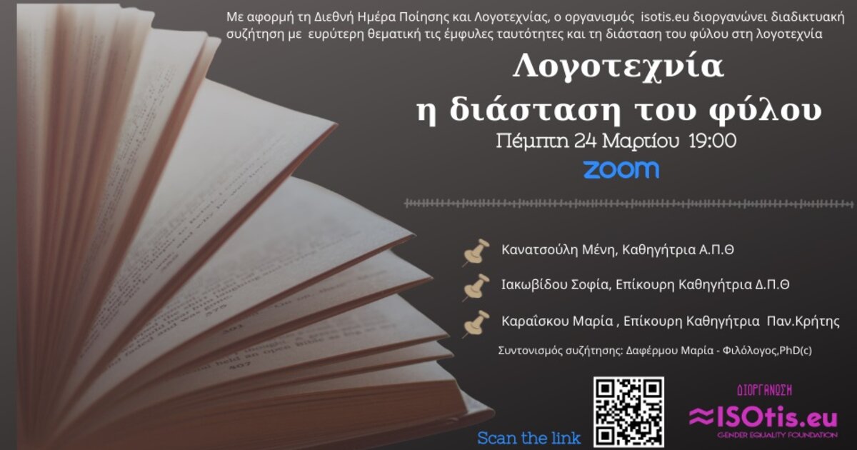 Με αφορμή την Παγκόσμια Ημέρα Ποίησης και Λογοτεχνίας, ο οργανισμός Ισότης -isotis.eu διοργανώνει διαδικτυακή συζήτηση με θέμα Λογοτεχνία: Η διάσταση του φύλου, την Πέμπτη 24 Μαρτίου 2022 και ώρα 19.00.