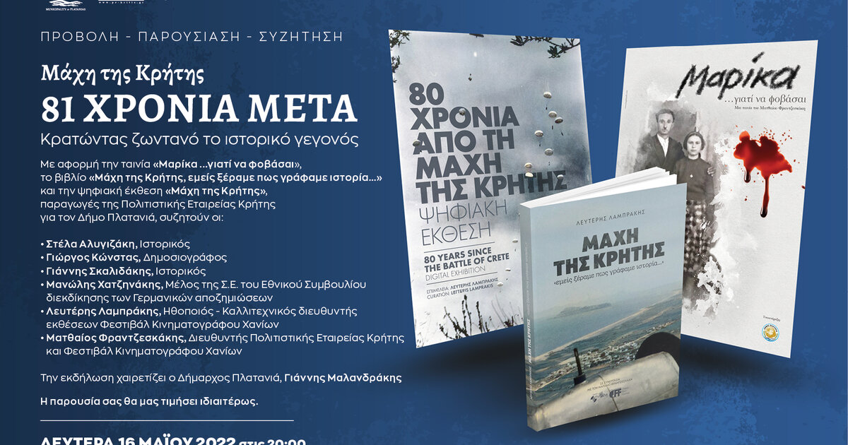 Η Πολιτιστική Εταιρεία Κρήτης σε συνεργασία με τον Δήμο Πλατανιά,στο πλαίσιο των εορτασμών της 81ης επετείου από την Μάχη της Κρήτης, διοργανώνει την Δευτέρα 16 Μαΐου 2022 στις 8 μ.μ. στο Πολύκεντρο Βουκολιών του Δήμου Πλατανιά εκδήλωση με θέμα :