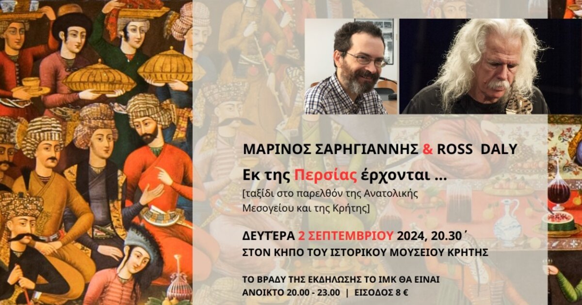 Ο φετινός κύκλος εκδηλώσεων του Άμα Βραδιάσει ολοκληρώνεται τη Δευτέρα 2 Σεπτεμβρίου με μια βραδιά ομιλίας και μουσικής. Ο ιστορικός Μαρίνος Σαρηγιάννης και ο μουσικός Ross Daly συμπράττουν στον κήπο του Ιστορικού Μουσείου Κρήτης σε ένα ταξίδι στο παρελθόν της Ανατολικής Μεσογείου και της Κρήτης.