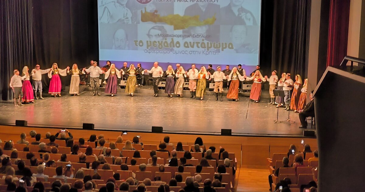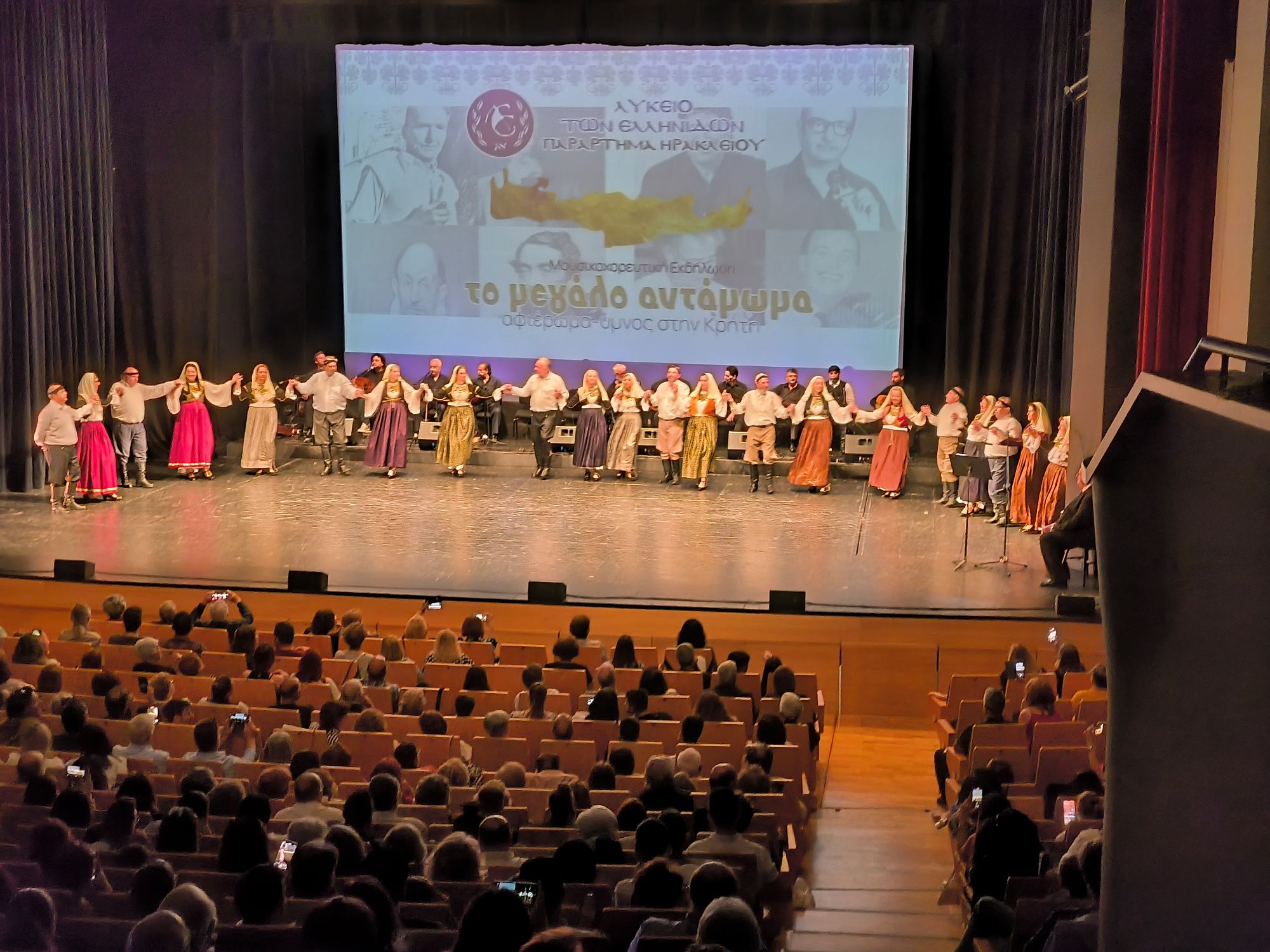 Ασφυκτικά γέμισε από το κόσμο χθες βράδυ το Πολιτιστικό Κέντρο Ηρακλείου όπου οι πολίτες με δωρεάν είσοδο παρακολούθησαν την εκπληκτική μουσικοχορευτική εκδήλωση του Λυκείου Ελληνίδων Ηρακλείου με τίτλο: «Το Μεγάλο Αντάμωμα. Αφιέρωμα- Ύμνος στην Κρήτη».