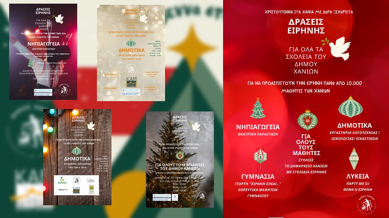 Τέλος, ο Δήμος Χανίων σε συνεργασία με τις Διευθύνσεις Πρωτοβάθμιας και Δευτεροβάθμιας Εκπαίδευσης Χανίων, την ΚΕΠΠΕΔΗΧ-ΚΑΜ, τη Δ.Ε.ΔΙ.Σ.Α. Α.Ε., την ΚΥΔΩΝ Α.Ε., φορείς του τόπου, εκπαιδευτικούς και καλλιτέχνες διοργανώνει εκπαιδευτικές δράσεις ειρήνης, που επιχειρούν να ενώσουν τις φωνές των μαθητών για την παγκόσμια ειρήνη.