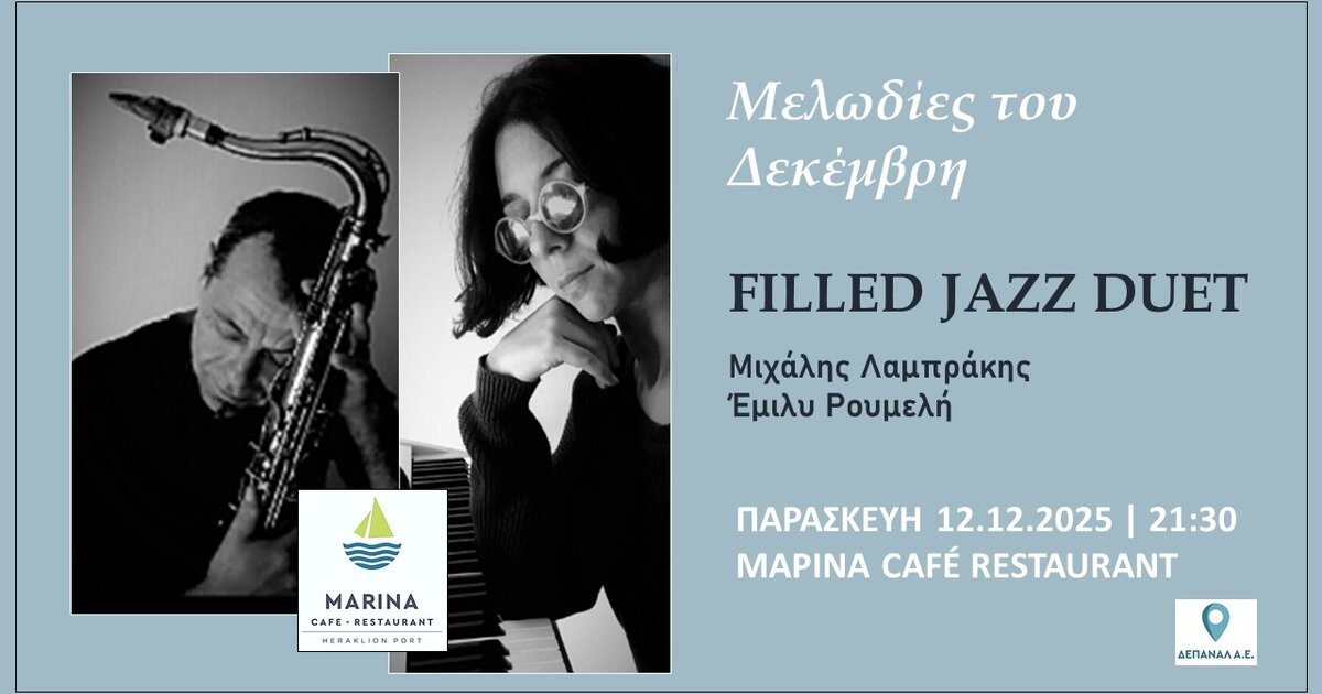 Το Café–Restaurant «Μαρίνα», στο ενετικό λιμάνι του Ηρακλείου, μετά την πρόσφατη ανακαίνισή του, προσκαλεί το κοινό να γνωρίσει και να υποδεχθεί το νέο χώρο με μια υπέροχη μουσική βραδιά, εκεί που η πόλη συναντά τη θάλασσα. Την Παρασκευή 12 Δεκεμβρίου, στις 21:00, οι Filled Jazz Duet, με τον Μιχάλη Λαμπράκη και την Έμιλυ Ρουμελή, θα πλημμυρίσουν τον χώρο με μελωδίες από το σαξόφωνο και το πιάνο σε ένα πρόγραμμα γεμάτο ρυθμό και αγαπημένες μελωδίες.