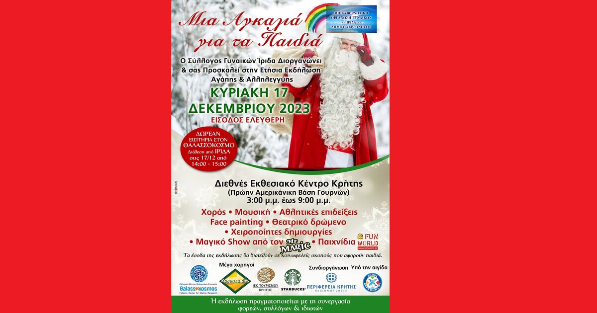 Ο Σύλλογος Γυναικών ΊΡΙΔΑ με επωνυμία Μη Κυβερνητική Οργάνωση Γυναικών ΊΡΙΔΑ Δήμου Χερσονήσου σας Προσκαλεί την Κυριακή 17 Δεκεμβρίου 2023, στο Διεθνές Εκθεσιακό Κέντρο Κρήτης (πρώην Αμερικανική Βάση Γουρνών) από τις 15.00-21.00 μ.μ.. στην Χριστουγεννιάτικη Εκδήλωση Αγάπης και Αλληλεγγύης με τίτλο «Μια Αγκαλιά για τα Παιδιά» που διοργανώνει για δέκατη τρίτη (13) συνεχόμενη χρονιά.
