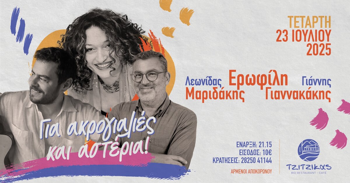 Την Τετάρτη 23 Ιουλίου στις 21:15 στον Τζίτζικα, στους Αρμένους Αποκορώνου, θα φιλοξενηθούν η Ερωφίλη, ο Λεωνίδας Μαριδάκης και ο Γιάννης Γιαννακάκης.