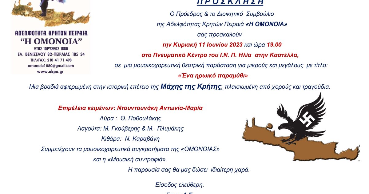 Μουσικοχορευτική θεατρική παράσταση για μικρούς και για μεγάλους με τίτλο "Ένα ηρωικό παραμύθι" πραγματοποιεί η Αδελφότητα Κρητών Πειραιά "Η Ομόνοια" στο Πνευματικό Κέντρο του Ι.Ν. Προφήτη Ηλία στην Καστέλλα, την Κυριακή 11 Ιουνίου στις 19.00.