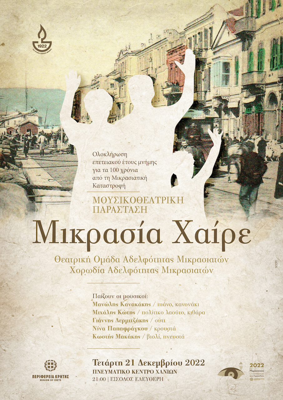 Με αφορμή την ολοκλήρωση του επετειακού έτους μνήμης για τα 100 χρόνια από την Μικρασιατική Καταστροφή, η Περιφέρεια Κρήτης-Περιφερειακή Ενότητα Χανίων παρουσιάζει την μουσικοθεατρική παράσταση με τίτλο «Μικρασία Χαίρε» από την Θεατρική Ομάδα και την Χορωδία της Αδελφότητας Μικρασιατών «Άγιος Πολύκαρπος», την Τετάρτη 21 Δεκεμβρίου 2022, ώρα 21:00, στο Πνευματικό Κέντρο Χανίων.