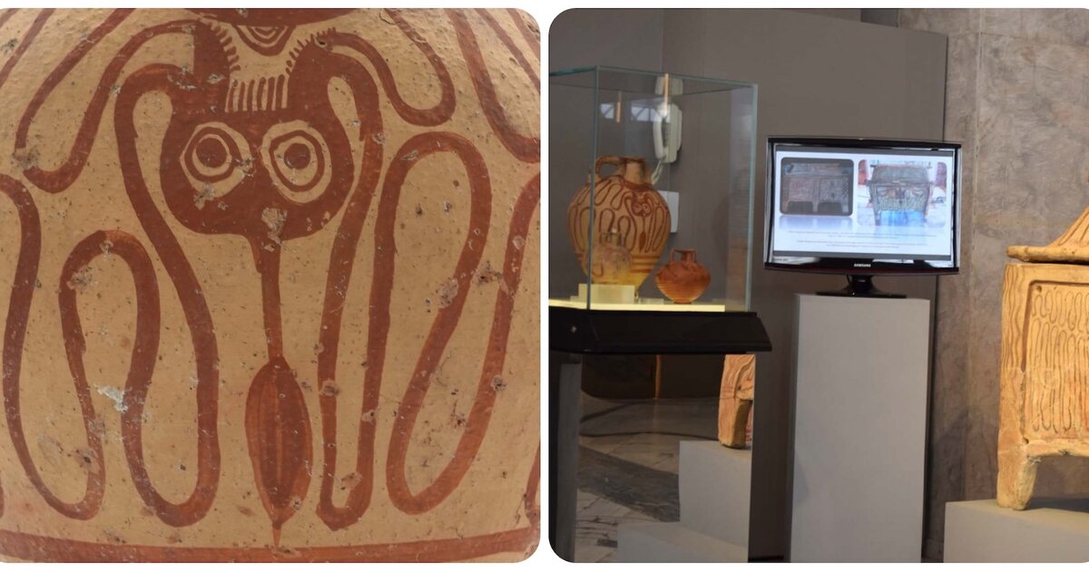 «Πρόκειται για απεικονίσεις μεγάλων χταποδιών που ‘τυλίγουν’ ασφυκτικά τις επιφάνειες της λάρνακας και των ψευδόστομων αμφορέων. Η λάρνακα, επιπλέον των πλοκάμων στο κάλυμμα αλλά και των χταποδιών στις μακρές πλευρές της, περιλαμβάνει φυτικά μοτίβα πιθανότατα από τον βυθό στις στενές πλευρές της. Γιατί, αν και μοιάζουν με άνθη ή με το Δέντρο της Ζωής, τα στοιχεία των καμπύλων γραμμών τους μας παραπέμπουν σε υποθαλάσσιο τοπίο. Έχουμε δηλαδή στη λάρνακα μία αλληγορία τοπιογραφίας του θαλάσσιου βυθού: φύκια και μεγάλα, σχηματικά χταπόδια», προσθέτει ο συνομιλητής του ΑΠΕ-ΜΠΕ.