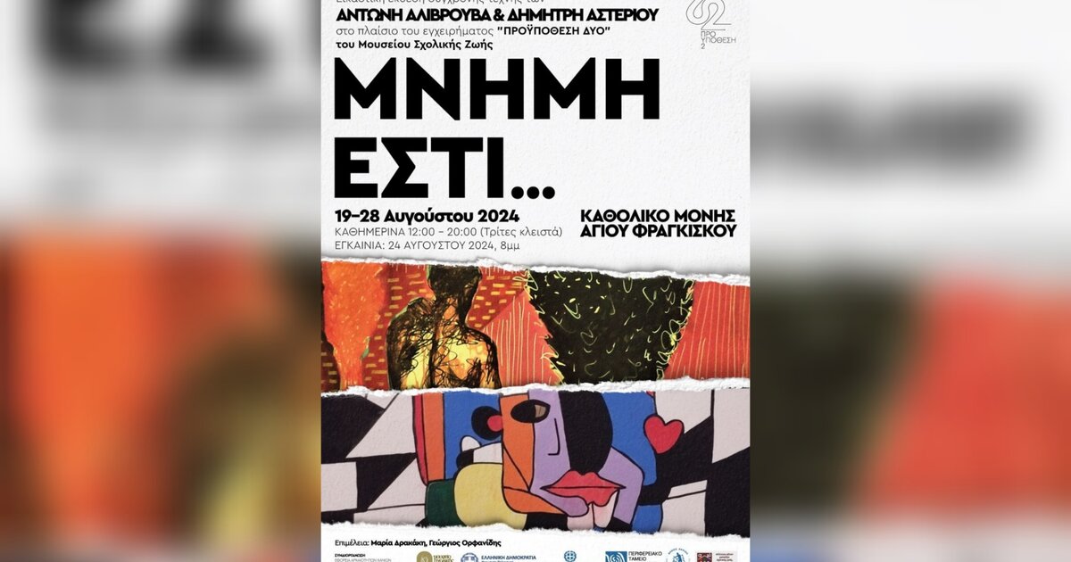 «ΜΝΗΜΗ ΕΣΤΙ…» ονομάζεται η εικαστική έκθεση σύγχρονης τέχνης στα Χανιάτων των Αντώνη Αλιβρούβα και Δημήτρη Αστερίου που θα φιλοξενηθεί στο Καθολικό της Μονής του Αγίου Φραγκίσκου, στα Χανιά, 19-28 Αυγούστου 2024 με τη στήριξη της Περιφέρειας Κρήτης