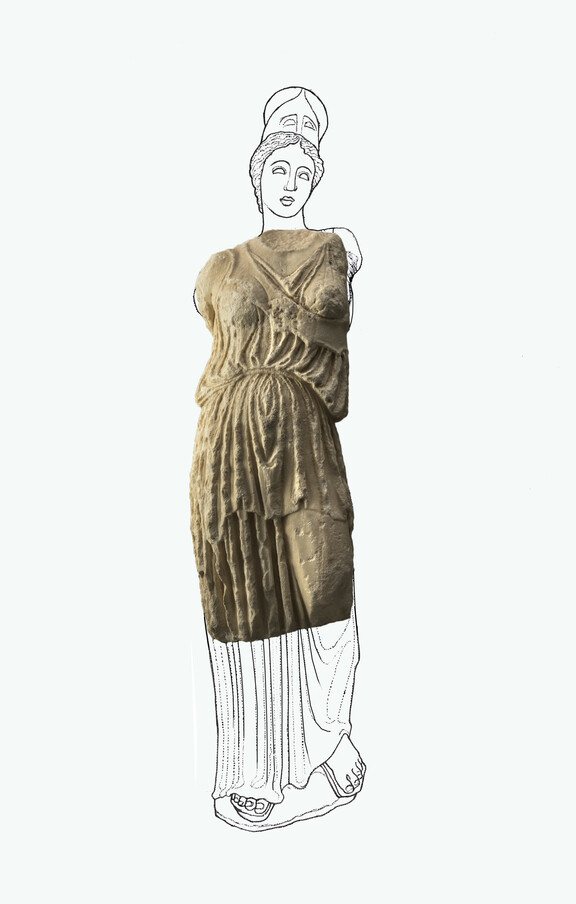 Φορά πέπλο, που οι πτυχές του αγκαλιάζουν τις καμπύλες του σώματος, και από πάνω στενή αιγίδα, περασμένη λοξά κάτω από την αριστερή μασχάλη. Στο κέντρο της αιγίδας υπήρχε αρχικά γοργόνειο, πιθανότατα μεταλλικό, προσαρμοσμένο στις οπές που ανοίγονται εκεί.