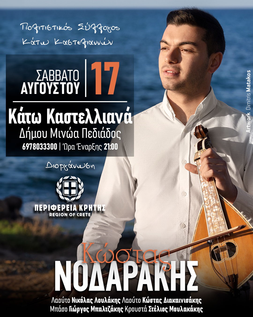 Συγκεκριμένα θα γίνουν δύο μουσικές εκδηλώσεις παραδοσιακής μουσικής με τον Κωνσταντίνο Νοδαράκη με ελεύθερη είσοδο και ώρα έναρξης 9 το βράδυ.