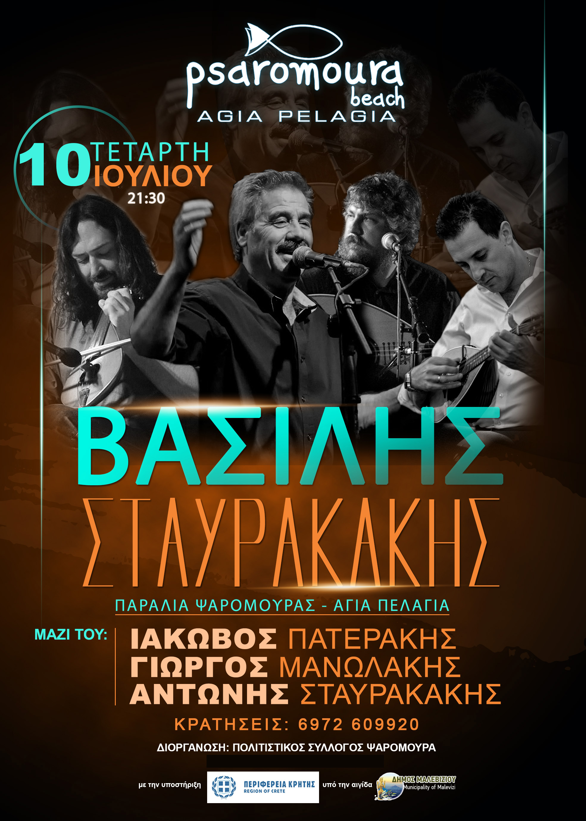 Μία αξέχαστη μουσική βραδιά περιμένει όλους όσους βρεθούν την Τετάρτη 10 Ιουλίου στην παραλία της Ψαρομούρας με τον Βασίλη Σταυρακάκη, πλαισιωμένο από τους Ιάκωβο Πατεράκη, Γιώργο Μανωλάκη και Αντώνη Σταυρακάκη. Ώρα έναρξης στις 21:30.