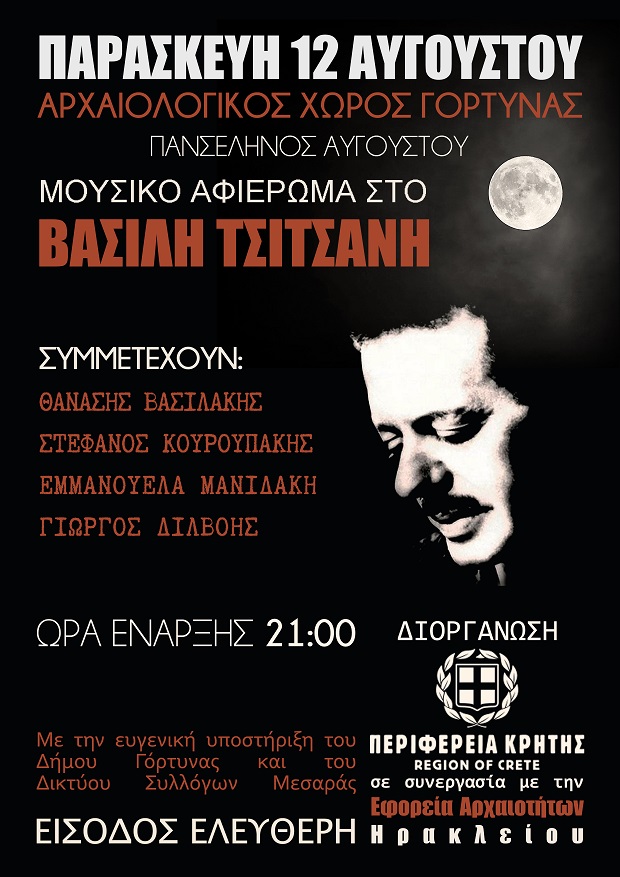 Την Παρασκευή 12 Αυγούστου στον Αρχαιολογικό χώρο Γόρτυνας, θα πραγματοποιηθεί μουσικό αφιέρωμα στον Βασίλη Τσιτσάνη.