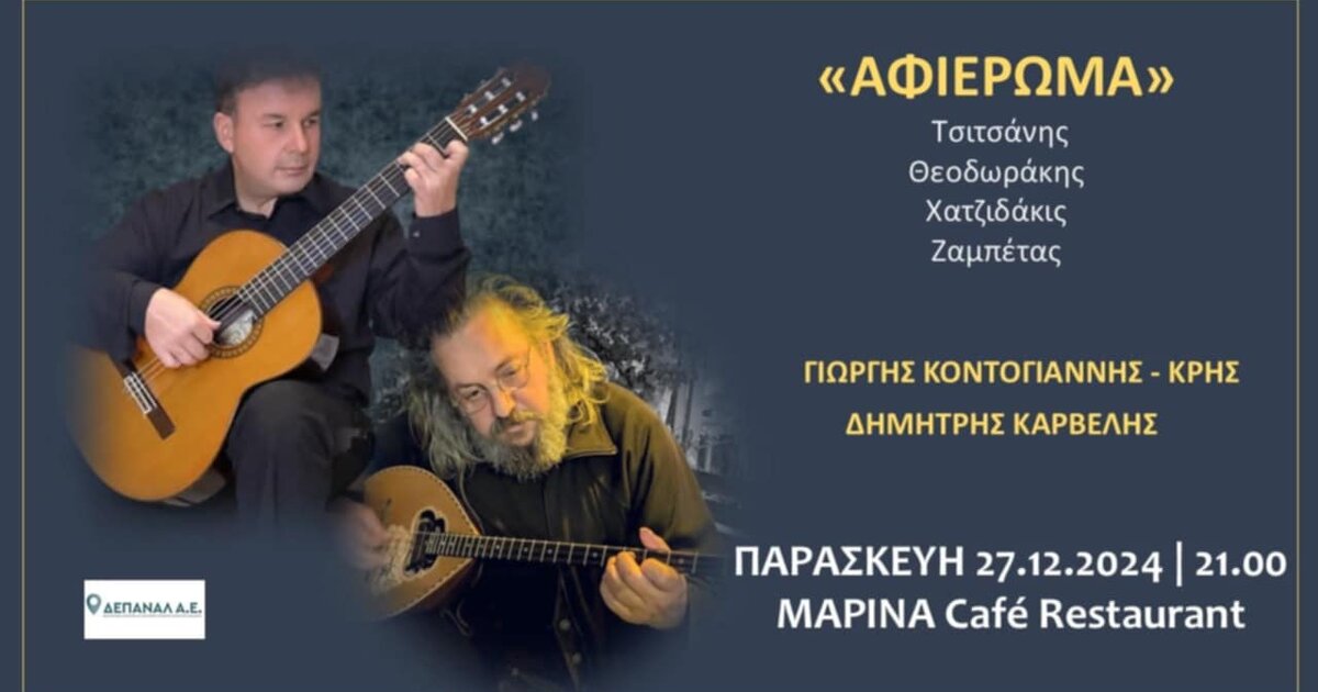 Κατά τη διάρκεια της μουσικής βραδιάς θα ακουστούν μεγάλες επιτυχίες των , Β.Τσιτσάνη Μ. Θεοδωράκη, Μ. Χατζιδάκι και Γ. Ζαμπέτα με ερμηνείες που θα χαρίσουν στο κοινό οι εκλεκτοί καλλιτέχνες Δημήτρης Καρβέλης και Γιώργης Κοντογιάννης-Κρης. "Mαρίνα" Café Restaurant. Τηλ. κρατήσεων 2810.221345