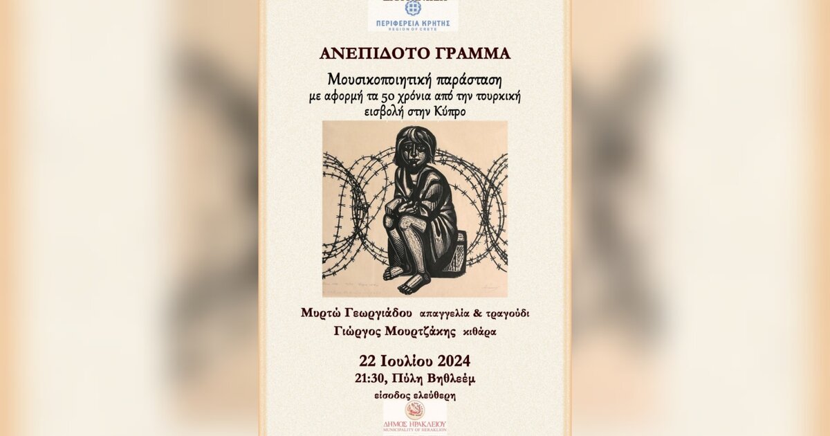 Η μουσικοποιητική παράσταση “Ανεπίδοτο γράμμα”, αφιερωμένη στα 50 χρόνια από την τουρκική εισβολή στην Κύπρο, θα παρουσιαστεί τη Δευτέρα 22 Ιουλίου 2024, στις 21:00, στην Πύλη Βηθλεέμ, με τη στήριξη της Περιφέρειας Κρήτης και την υποστήριξη του Δήμου Ηρακλείου με ελεύθερη είσοδο για το κοινό.