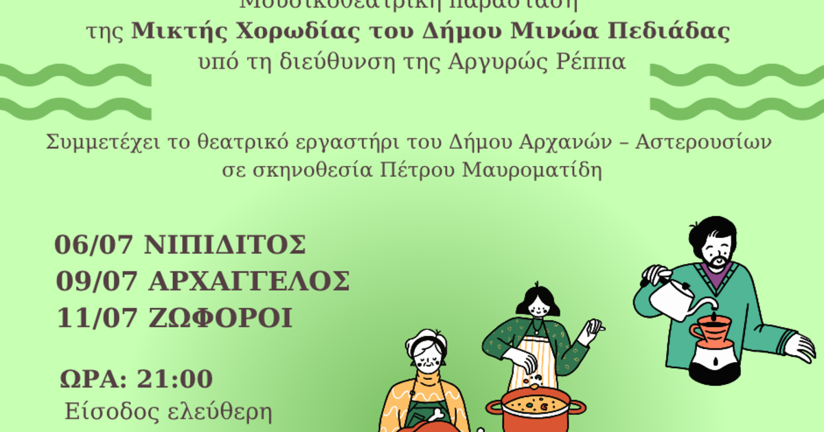 Ο Δήμος Μινώα Πεδιάδας με ιδιαίτερη χαρά ανακοινώνει μια σειρά εμφανίσεων της Μικτής Χορωδίας του Δήμου Μινώα Πεδιάδας που ανεβάζει τη μουσικοθεατρική παράσταση "Επτά πρόσφορα κι ένα Προφιτερόλ", υπό τη διεύθυνση της μαέστρου Αργυρούς Ρέππα. Στην παράσταση συμμετέχει το Θεατρικό Εργαστήρι του Δήμου Αρχανών-Αστερουσίων, σε σκηνοθεσία του Πέτρου Μαυροματίδη.