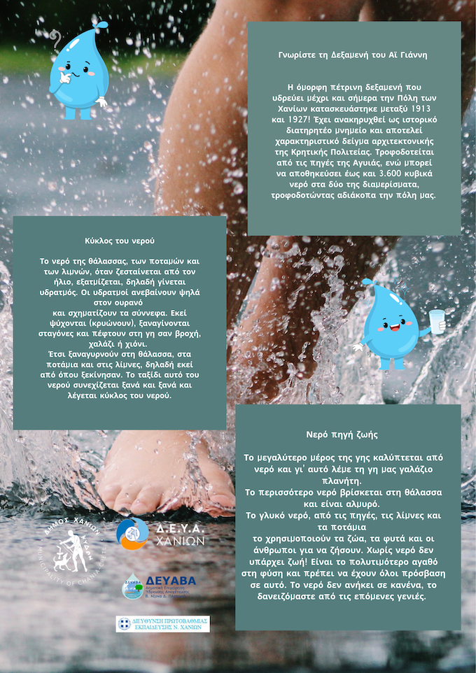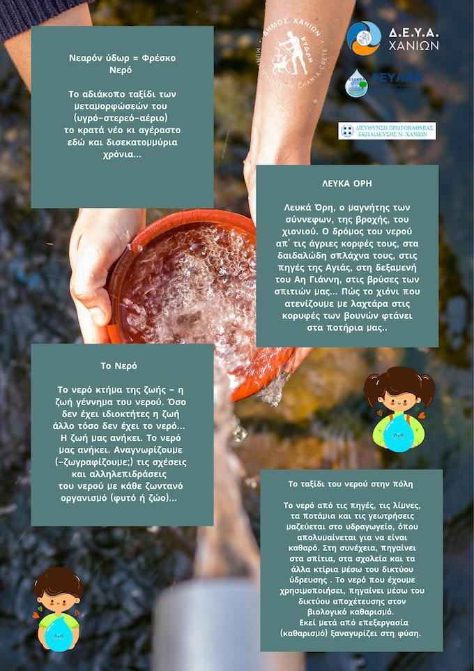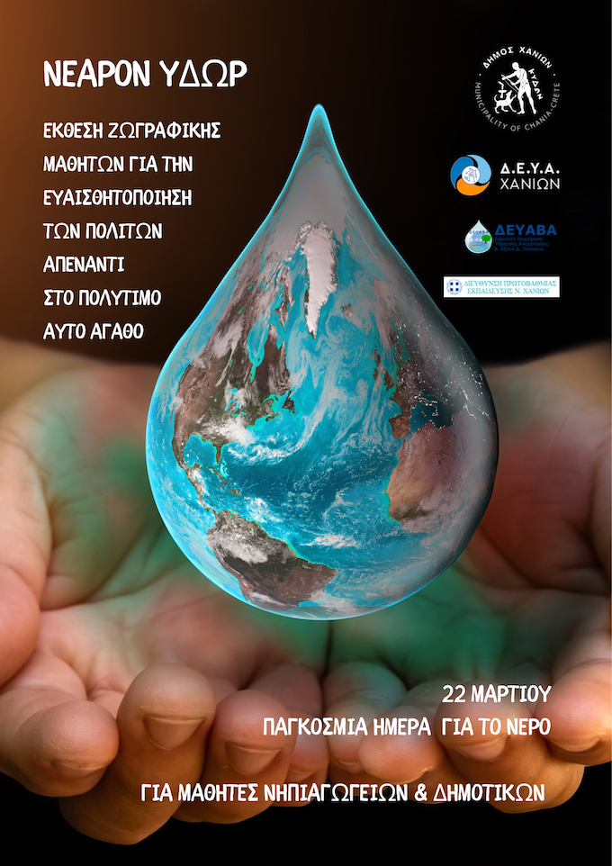 Ο Δήμος Χανίων και το Σωματείο Εργαζομένων Δ.Ε.Υ.Α.Χ. και ΔΕΥΑΒΑ, στο πλαίσιο του εορτασμού της σημερινής Παγκόσμιας Ημέρας Νερού, καλούν μαθήτριες και μαθητές Νηπιαγωγείων και Δημοτικών Σχολείων να συμμετάσχουν στην έκθεση ζωγραφικής, με τίτλο «ΝΕΑΡΟΝ ΥΔΩΡ». Στόχος της έκθεσης είναι η ευαισθητοποίηση των πολιτών απέναντι στο πολύτιμο αγαθό του νερού.